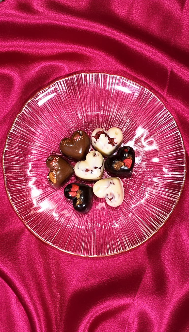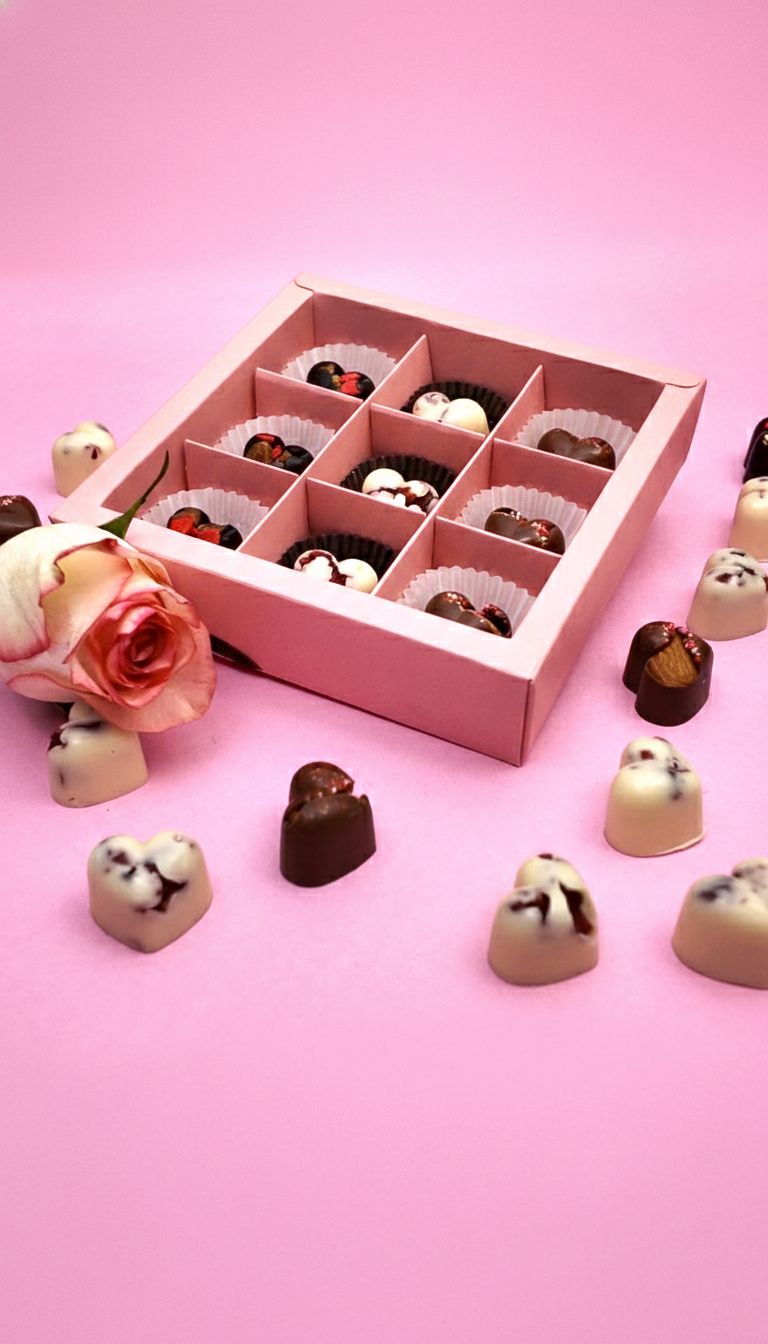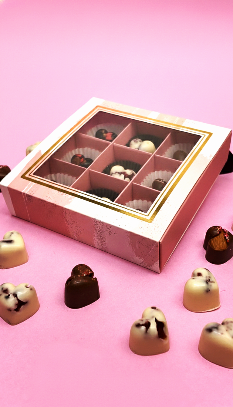 A box of 9 handcrafted heart-shaped chocolates made to melt hearts before they melt in your mouth.